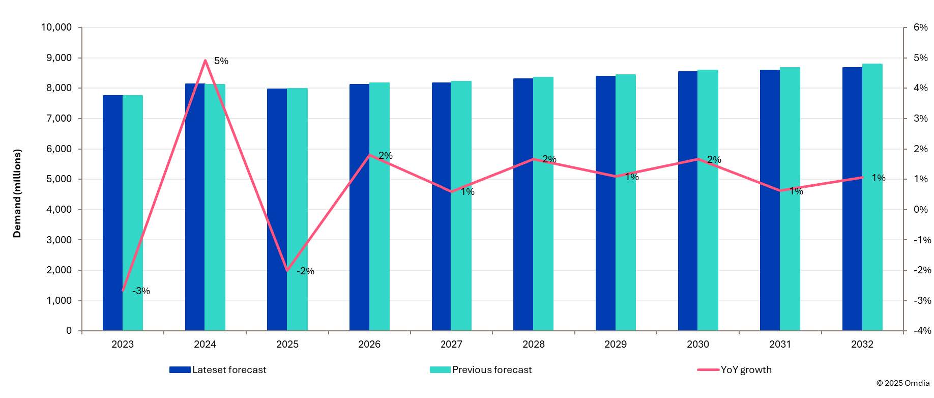 • 預計2025年全球顯示驅動芯片出貨量將同比下降2%,2026年將實現2%的同比溫和增長。