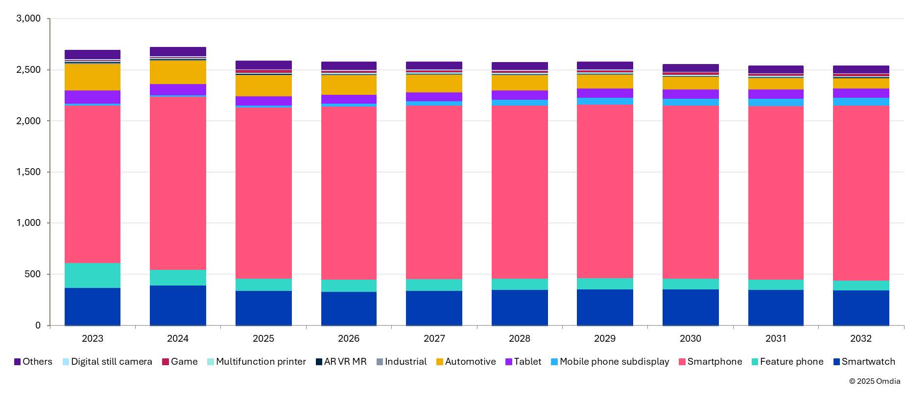 智慧手錶DDIC需求佔中小尺寸細分市場的約14%。2025年,LCD智慧手錶DDIC需求將同比銳減28%。此外,平板電腦和汽車顯示面板的尺寸正在持續增長。被定義為中小尺寸的9英寸及以下尺寸的需求正在縮減。因此,2025年中小尺寸DDIC的總需求預計將同比下降5%,並在長期內保持穩定。