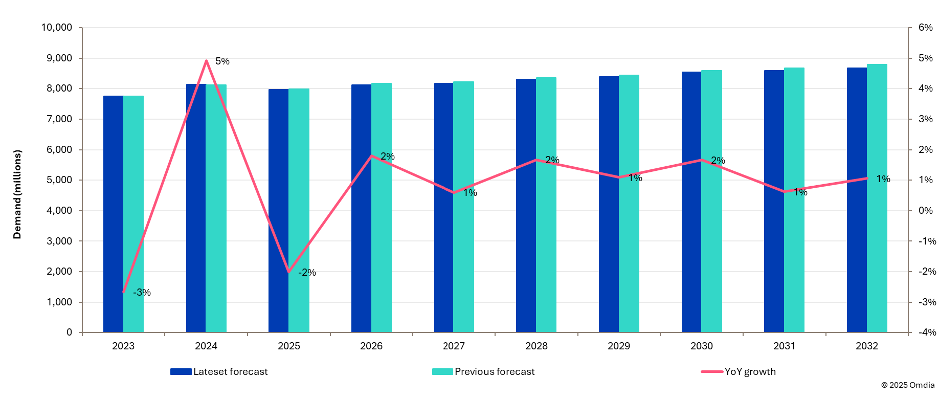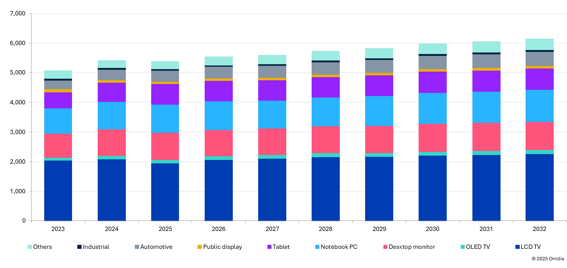 LCD电视DDIC细分市场是大尺寸显示DDIC市场中最重要的一部分,占市场份额约40%。自2023年初以来,中国大陆面板厂商已采用按订单生产策略。面板厂商正致力于扩大显示面板尺寸,并优先考虑利润而非出货量增长。受中国补贴政策、关税上调以及面板价格上涨趋势预期影响,LCD电视面板需求从2025年下半年提前被拉动至2025年上半年。Omdia预计2025年下半年LCD电视面板需求将下滑,因电视供应链参与者在2025年上半年已充分备货,且关税上调及地缘政治危机加剧带来的挑战更为严峻。Omdia预计2025年LCD电视面板出货量将同比下降0.7%,而LCD电视DDIC需求将同比下降6.6%,这主要是由于LCD电视显示面板中DRD (dual-rate driving) 和TRD (triple-rate driving) 技术的采用率不断提高。