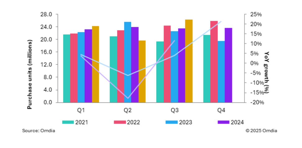 尽管整体环境仍具挑战性,电视品牌仍需补充面板库存以配合年度业务计划。然而,由于市场需求不确定性升高,品牌厂商纷纷下调 2025 年的出货目标。若无法有效改善整机业务亏损情况,面板需求将面临下行压力。